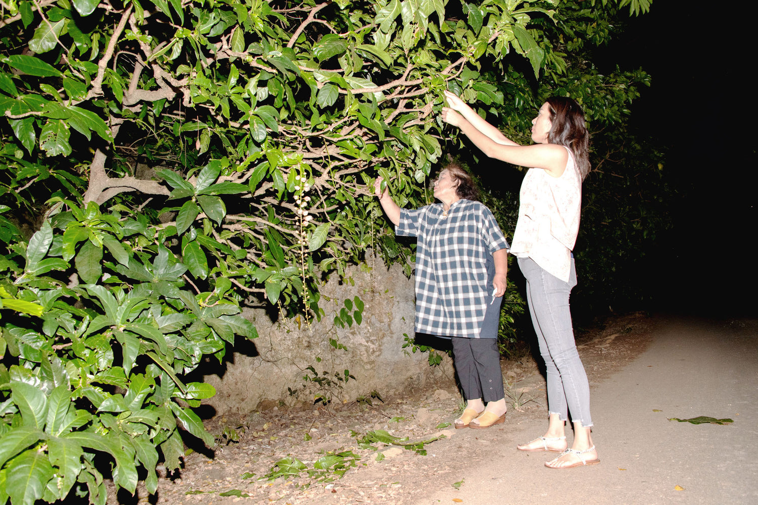 サガリバナが美しく咲いてくれるように、米盛さんに教えて頂きながら葉を取っているシーン。取材は観光客の方々が訪れる6月〜9月中旬を避け、10月初旬に行っています。ですので、ハイシーズンのように満開にはなりませんでしたが、21時すぎから、キレイなサガリバナを観ることができました。