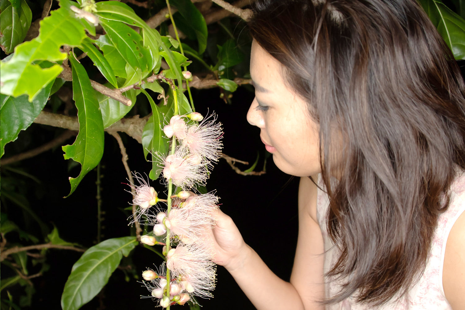 maaiのファーストプロダクトのキーコンセプトである、サガリバナの香り。咲き始めの21頃、花が満開の午前1時、散ってしまう午前5時頃に、滞在中に視察を重ね、香りを確認しました。「香りが時間ごとに微妙に異なるのがサガリバナの面白いところだから、時間帯を分けて視察を!」と米盛さんから教えて頂いたので、何度も確認し香りを身体で覚えました。